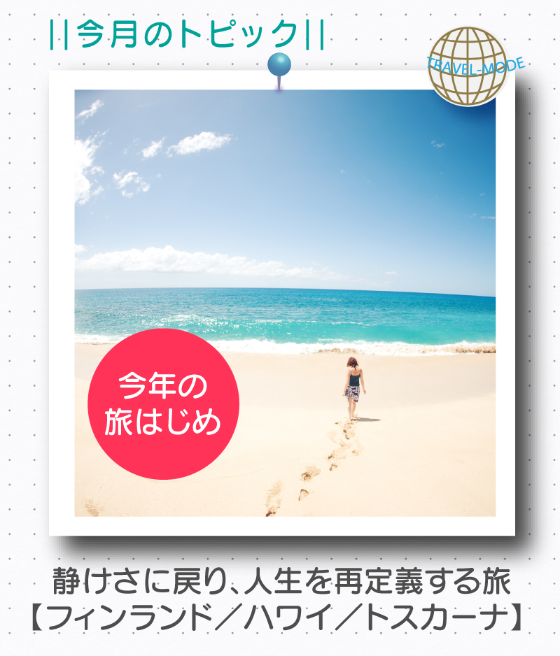 一年の始まりは、人生の軸を整える時間。TRAVEL-MODE1月号では「リセット・原点・再定義」をテーマに、心と感覚を澄ませる3つの旅を提案します。静けさに身を委ねるフィンランド、自分自身と再会するハワイ、人生の味わいを深めるトスカーナ。旅は最良のサプリ。未来の選択を静かに後押ししてくれるでしょう。