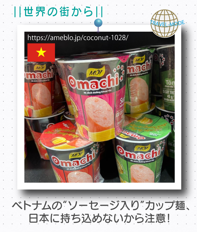 「マダムの前世はベトナム人さん」の2025.12.14のブログから、「ベトナムの“ソーセージ入り”カップ麺、日本に持ち込めないから注意!」をお送りします。年末年始の休暇旅行に限らずベトナム旅行に行かれる方へ、マダムより必見情報の提供です!!カップや包装の中までは、うっかり見落としがちです。渡航前に今一度、帰国時日本へ持ち込めないものも確認しておきましょう。